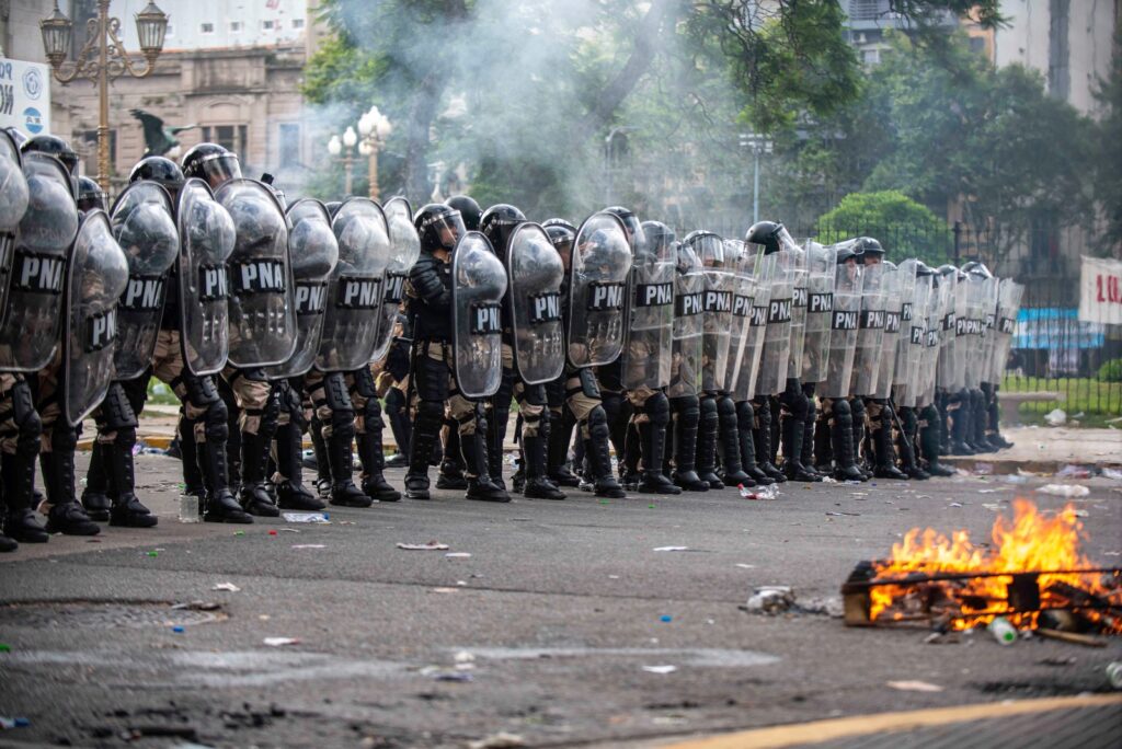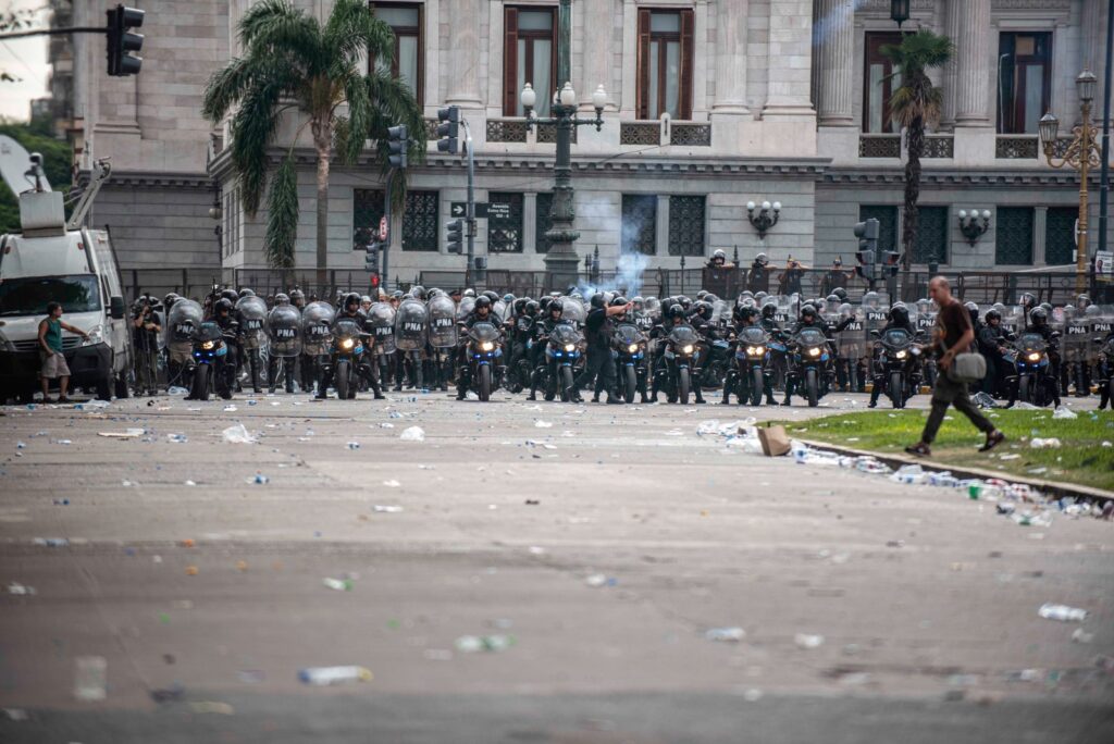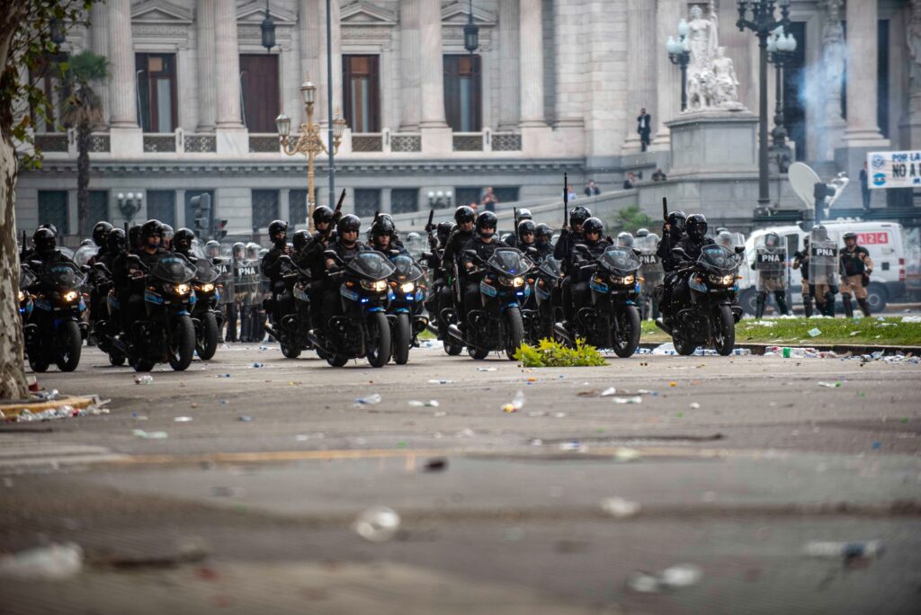 El mega operativo, que le cuida los intereses a este gobierno hambreador, sigue en la Plaza custodiando a los miserables que esta madrugada intentarán meter está Reforma Laboral esclavista. Durante la tarde salieron de cacería, con infiltrados que les sirvieron de excusa, tirando balazos de goma y gases a jubilados, estudiantes y laburantes.